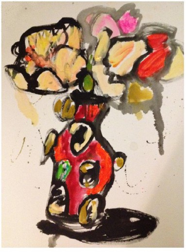 Voor het raam van Petra’s kleine woonbootje stond een vaas met bloemen. Getroffen door de schoonheid van de uitbundige vormen, de weelderige kleuren en het verstrijkende licht heeft zij die op het doek vereeuwigd.